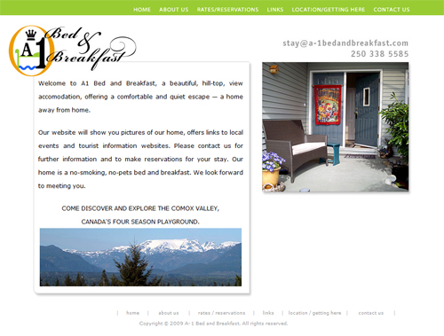 A-1 Bed and Breakfast is located in the Comox Valley on Vancouver Island, British Columbia. Guests can expect lots of TLC, information on local activies and events as well as a scrumptious breakfast often right from the garden. Gorgeous home-grown flowers decorate the home. This brochure website gives prospective travelers and vacationers the who, what, why, where and how much.
